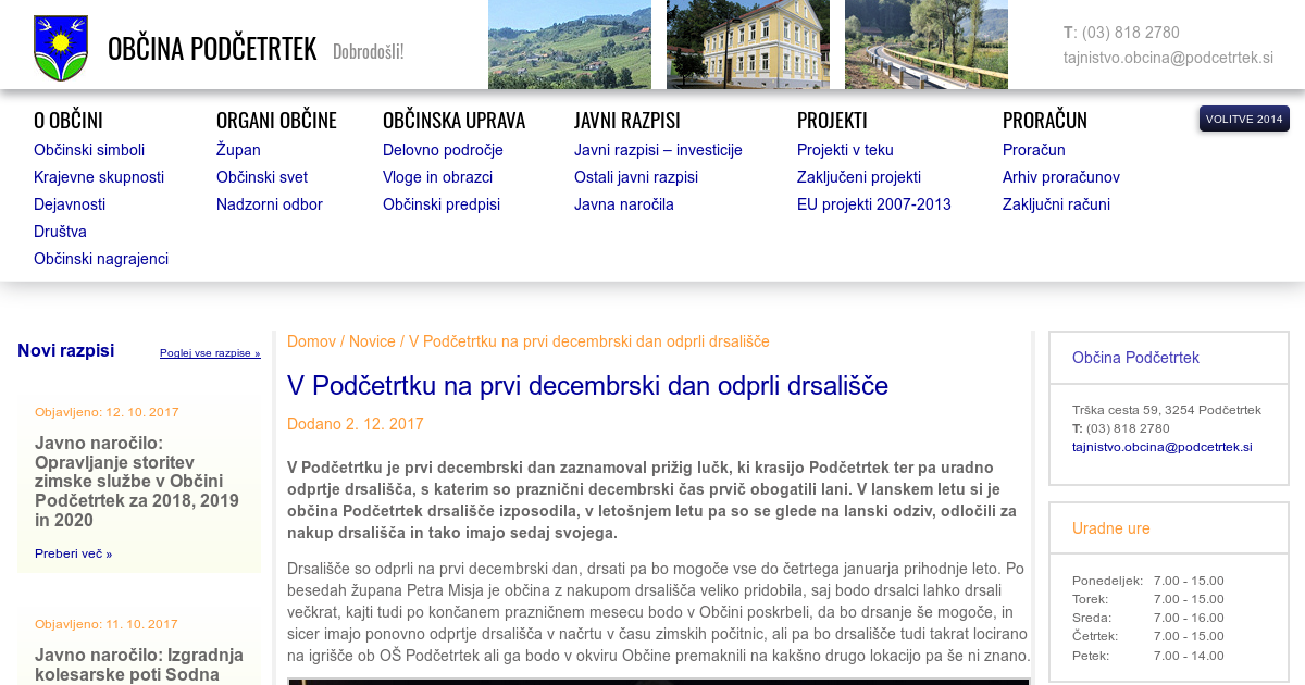 V Podčetrtku je prvi decembrski dan zaznamoval prižig lučk, ki krasijo Podčetrtek ter pa uradno odprtje drsališča, s katerim so praznični decembrski čas prvič obogatili lani. V lanskem letu si je občina Podčetrtek drsališče izposodila, v letošnjem letu pa so se glede na lanski odziv, odločili za nakup drsališča in tako imajo sedaj svojega. Drsališče so