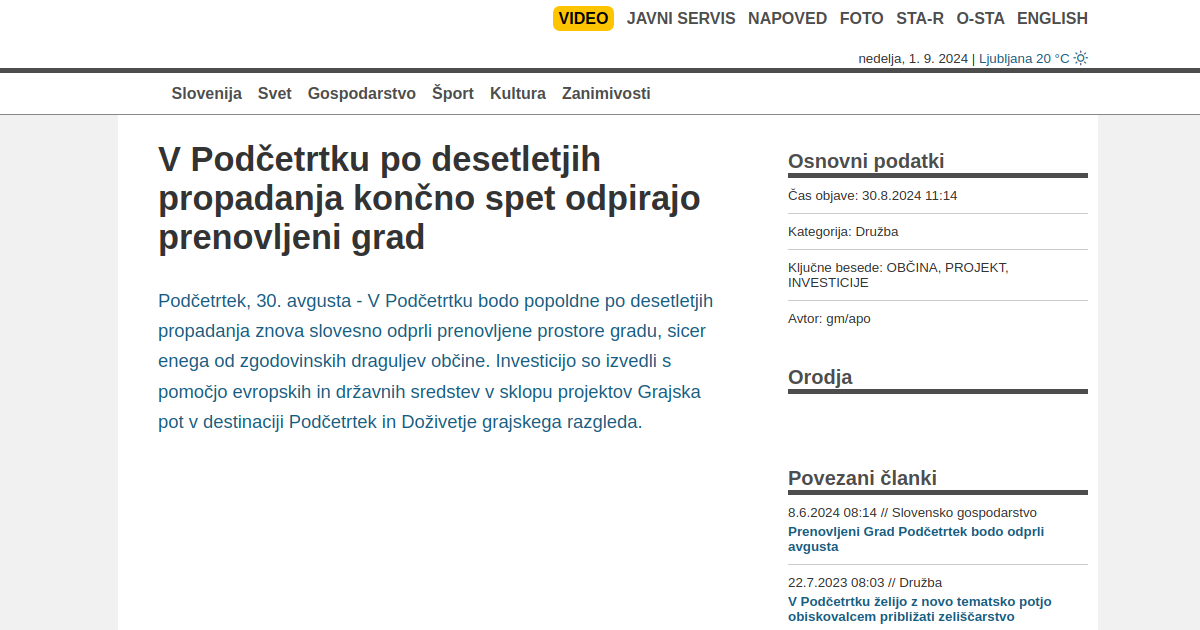 V Podčetrtku bodo popoldne po desetletjih propadanja znova slovesno odprli prenovljene prostore gradu, sicer enega od zgodovinskih draguljev občine. Investicijo so izvedli s pomočjo evropskih in državnih sredstev v sklopu projektov Grajska pot v destinaciji Podčetrtek in Doživetje grajskega razgleda.