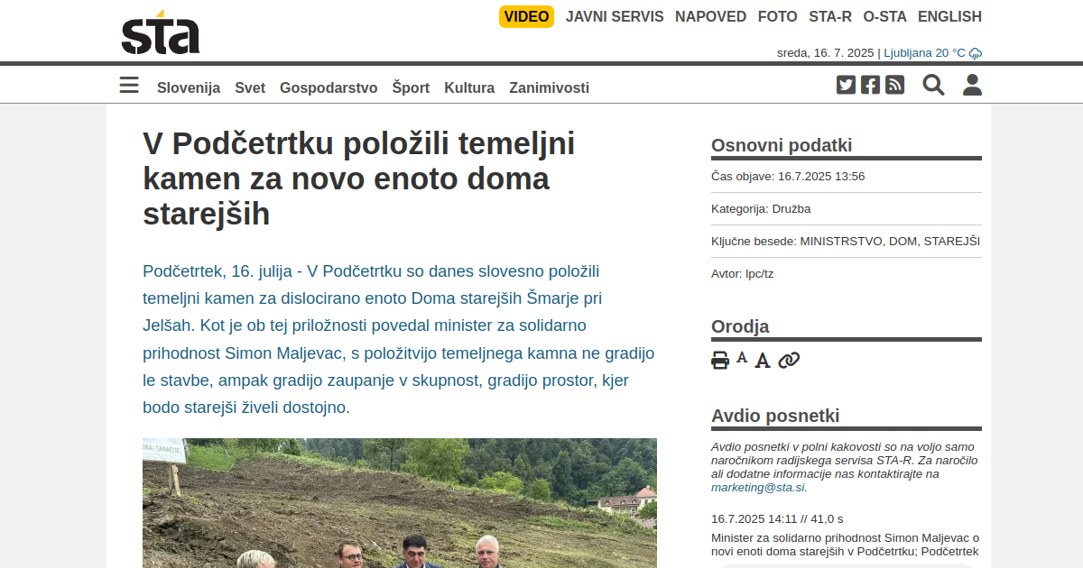 V Podčetrtku so danes slovesno položili temeljni kamen za dislocirano enoto Doma starejših Šmarje pri Jelšah. Kot je ob tej priložnosti povedal minister za solidarno prihodnost Simon Maljevac, s položitvijo temeljnega kamna ne gradijo le stavbe, ampak gradijo zaupanje v skupnost, gradijo prostor, kjer bodo starejši živeli dostojno.