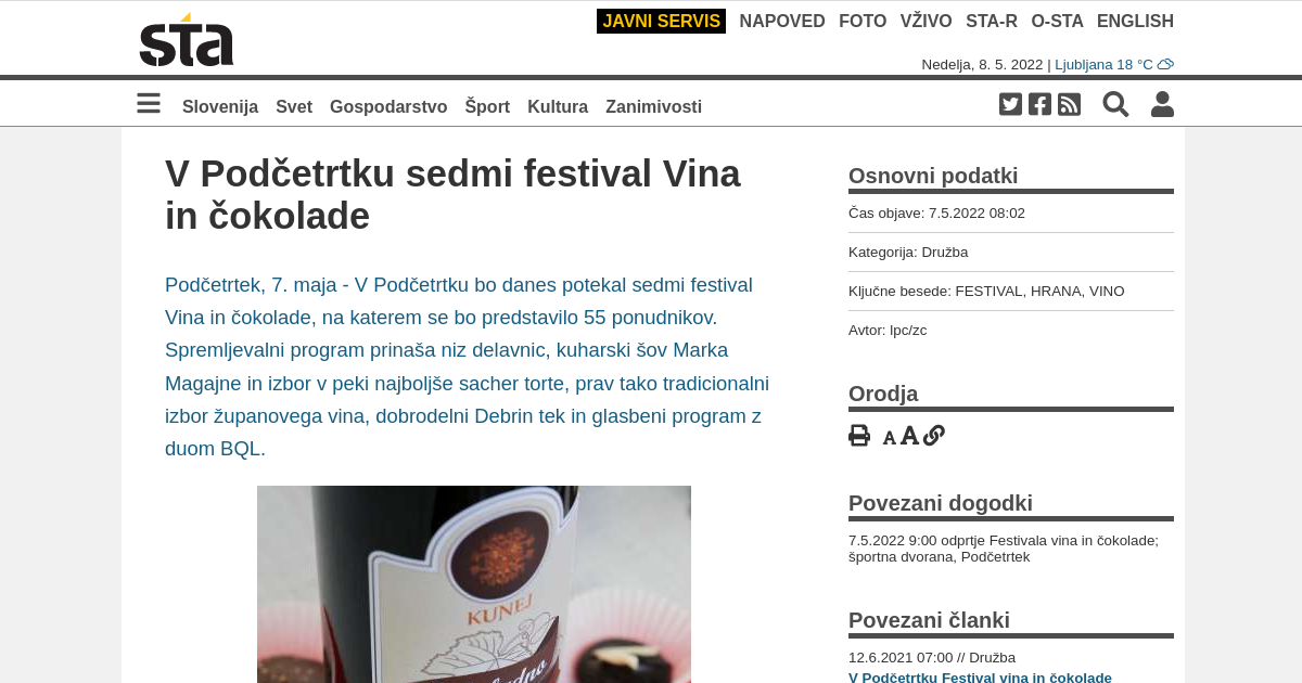 V Podčetrtku bo danes potekal sedmi festival Vina in čokolade, na katerem se bo predstavilo 55 ponudnikov. Spremljevalni program prinaša niz delavnic, kuharski šov Marka Magajne in izbor v peki najboljše sacher torte, prav tako tradicionalni izbor županovega vina, dobrodelni Debrin tek in glasbeni program z duom BQL.