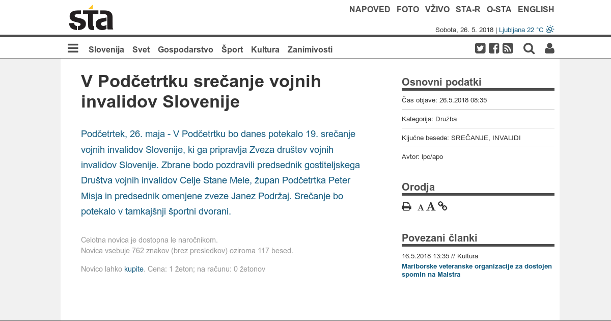 V Podčetrtku bo danes potekalo 19. srečanje vojnih invalidov Slovenije, ki ga pripravlja Zveza društev vojnih invalidov Slovenije. Zbrane bodo pozdravili predsednik gostiteljskega Društva vojnih invalidov Celje Stane Mele, župan Podčetrtka Peter Misja in predsednik omenjene zveze Janez Podržaj. Srečanje bo potekalo v tamkajšnji športni dvorani.