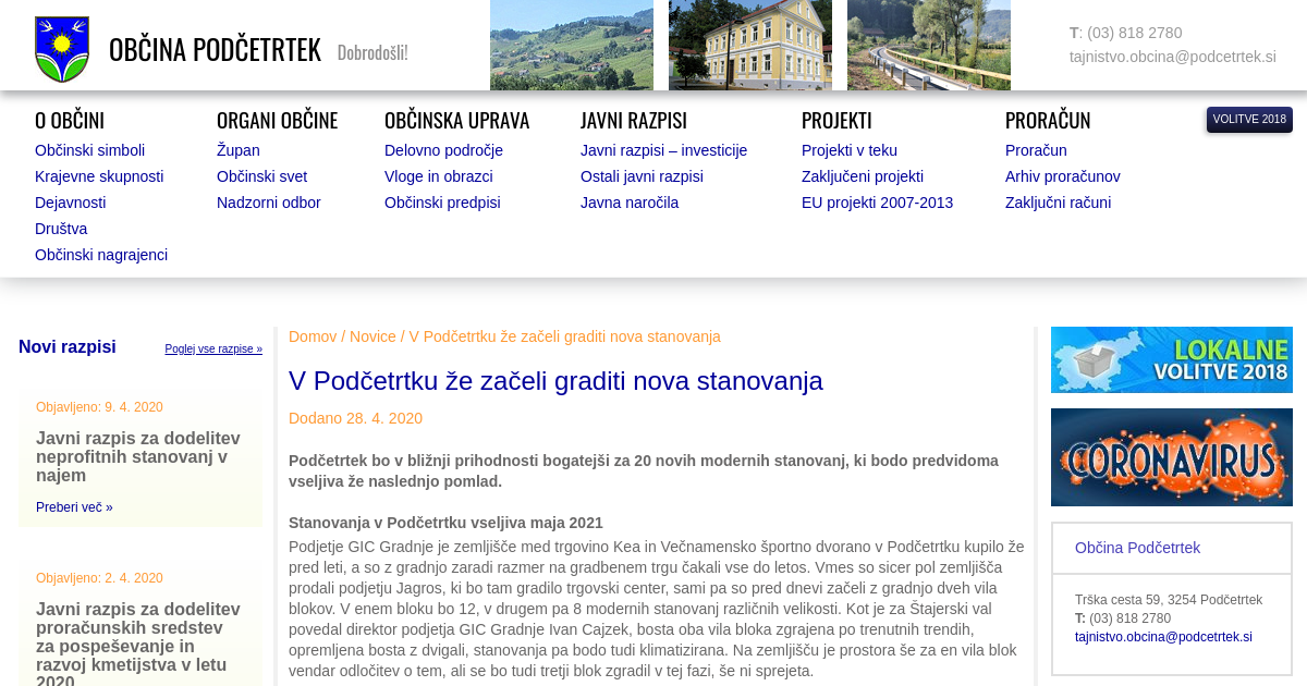 Podčetrtek bo v bližnji prihodnosti bogatejši za 20 novih modernih stanovanj, ki bodo predvidoma vseljiva že naslednjo pomlad. Stanovanja v Podčetrtku vseljiva maja 2021 Podjetje GIC Gradnje je zemljišče med trgovino Kea in Večnamensko športno dvorano v Podčetrtku kupilo že pred leti, a so z gradnjo zaradi razmer na gradbenem trgu čakali vse do letos.