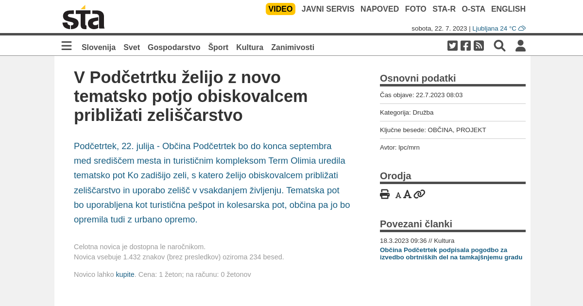 Občina Podčetrtek bo do konca septembra med središčem mesta in turističnim kompleksom Term Olimia uredila tematsko pot Ko zadišijo zeli, s katero želijo obiskovalcem približati zeliščarstvo in uporabo zelišč v vsakdanjem življenju. Tematska pot bo uporabljena kot turistična pešpot in kolesarska pot, občina pa jo bo opremila tudi z urbano opremo.