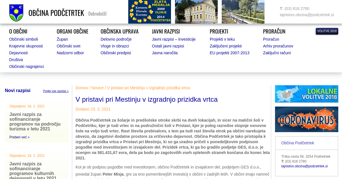 Občina Podčetrtek za šolarje in predšolske otroke skrbi na dveh lokacijah, in sicer na matični šoli v Podčetrtku, kjer je tudi vrtec in na podružnični šoli v Pristavi, kjer je poleg razredne stopnje osnovne šole na voljo tudi vrtec. Rast števila prebivalcev, s tem pa tudi rast števila otrok pa občini narekujeta obvezo, da zagotovi