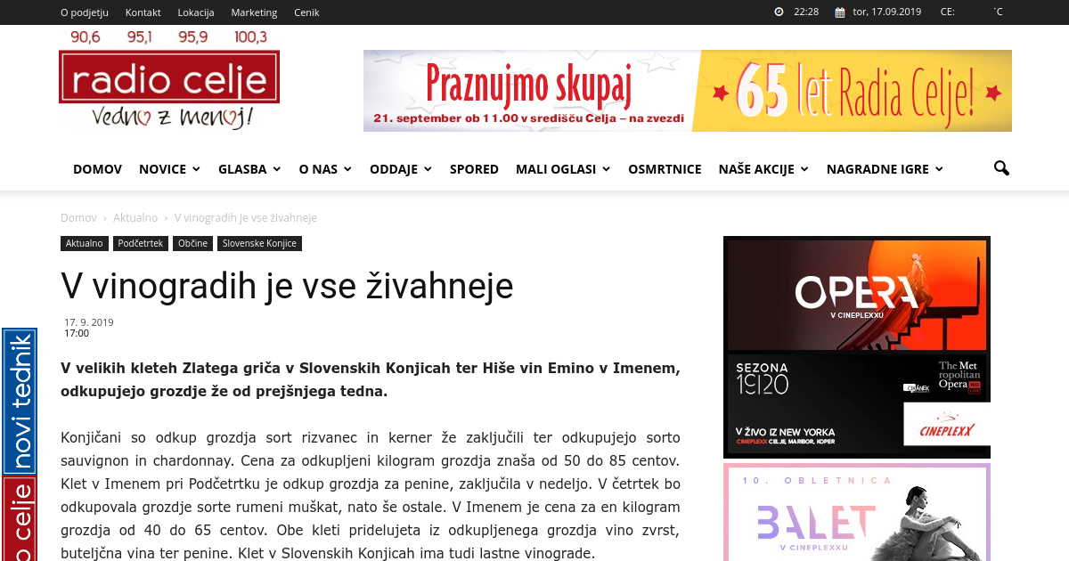 V velikih kleteh Zlatega griča v Slovenskih Konjicah ter Hiše vin Emino v Imenem, odkupujejo grozdje že od prejšnjega tedna. Konjičani so odkup grozdja sort rizvanec in kerner že zaključili ter odkupujejo sorto sauvignon in chardonnay. Cena za odkupljeni kilogram grozdja znaša od 50 do 85 centov. Klet v Imenem pri Podčetrtku je odkup grozdja