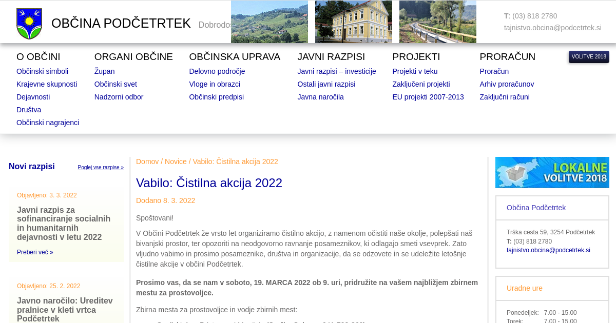 Spoštovani! V Občini Podčetrtek že vrsto let organiziramo čistilno akcijo, z namenom očistiti naše okolje, polepšati naš bivanjski prostor, ter opozoriti na neodgovorno ravnanje posameznikov, ki odlagajo smeti vsevprek. Zato vljudno vabimo in prosimo posameznike, društva in organizacije, da se odzovete in se udeležite letošnje čistilne akcije v občini Podčetrtek. Prosimo vas, da se nam