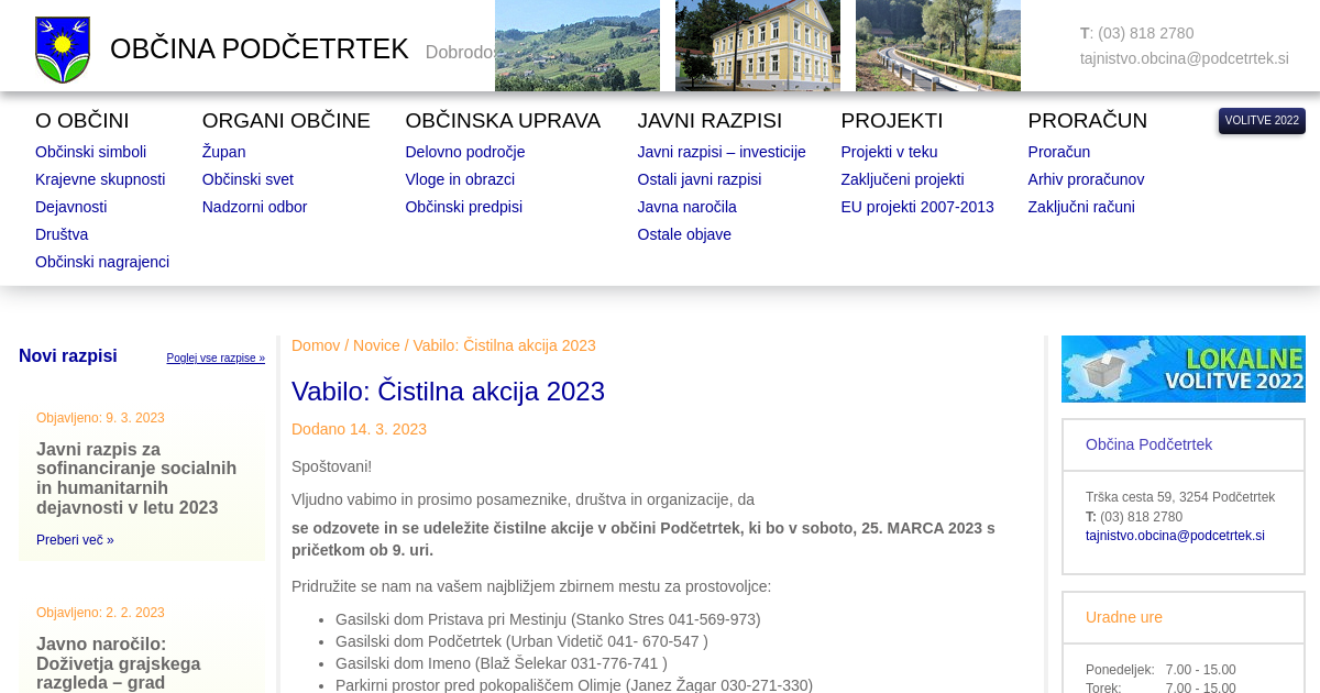 Spoštovani! Vljudno vabimo in prosimo posameznike, društva in organizacije, da se odzovete in se udeležite čistilne akcije v občini Podčetrtek, ki bo v soboto, 25. MARCA 2023 s pričetkom ob 9. uri. Pridružite se nam na vašem najbližjem zbirnem mestu za prostovoljce: Gasilski dom Pristava pri Mestinju (Stanko Stres 041-569-973) Gasilski dom Podčetrtek (Urban Videtič