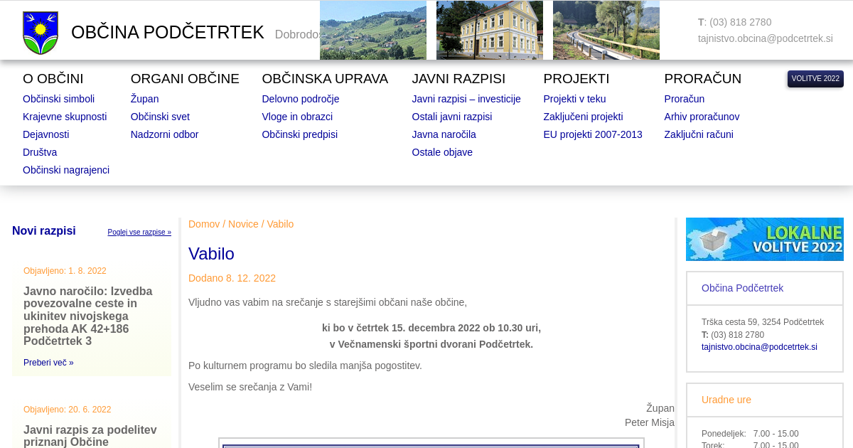 Vljudno vas vabim na srečanje s starejšimi občani naše občine, ki bo v četrtek 15. decembra 2022 ob 10.30 uri, v Večnamenski športni dvorani Podčetrtek. Po kulturnem programu bo sledila manjša pogostitev. Veselim se srečanja z Vami! Župan Peter Misja