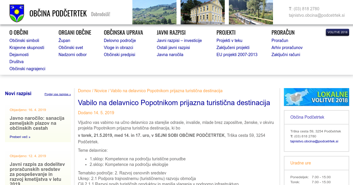 Vljudno vas vabimo na učno delavnico za starejše odrasle, invalide, mlade brez zaposlitve, ženske, v okviru projekta Popotnikom prijazna turistična destinacija, ki bo v torek, 21.5.2019, med 14. in 17. uro, v SEJNI SOBI OBČINE PODČETRTEK, Trška cesta 59, 3254 Podčetrtek. Teme delavnice: 1.sklop: Kompetence na področju turistične ponudbe 2.sklop: Kompetence na področju ekologije Tematsko