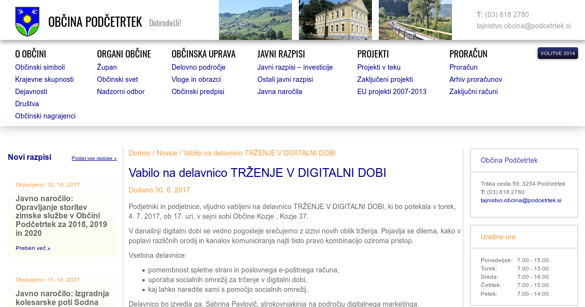 Podjetniki in podjetnice, vljudno vabljeni na delavnico TRŽENJE V DIGITALNI DOBI, ki bo potekala v torek, 4. 7. 2017, ob 17. uri, v sejni sobi Občine Kozje , Kozje 37. V današnji digitalni dobi se vedno pogosteje srečujemo z izzivi novih oblik trženja. Pojavlja se dilema, kako v poplavi različnih orodij in kanalov komuniciranja najti