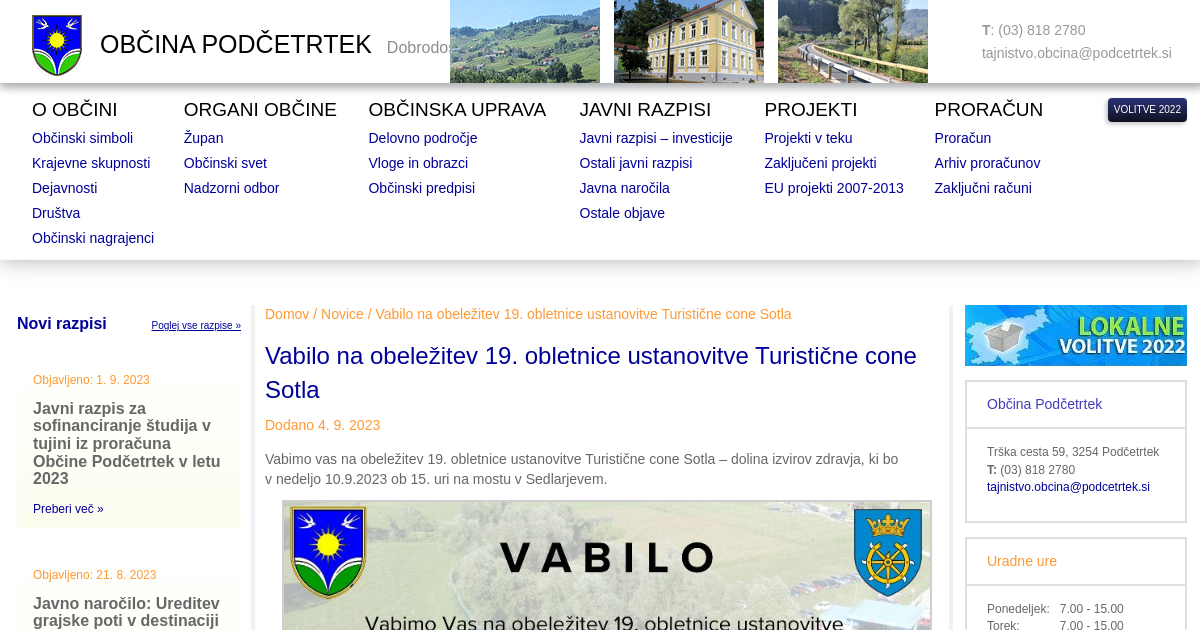 Vabimo vas na obeležitev 19. obletnice ustanovitve Turistične cone Sotla – dolina izvirov zdravja, ki bo v nedeljo 10.9.2023 ob 15. uri na mostu v Sedlarjevem.