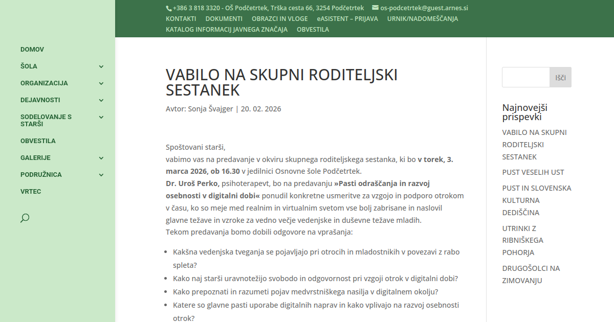 Spoštovani starši, vabimo vas na predavanje v okviru skupnega roditeljskega sestanka, ki bo v torek, 3. marca 2026, ob 16.30 v jedilnici Osnovne šole Podčetrtek. Dr. Uroš Perko, psihoterapevt, bo na predavanju »Pasti odraščanja in razvoj osebnosti v digitalni dobi« ponudil konkretne usmeritve za vzgojo in podporo otrokom v času, ko so meje med realnim in virtualnim svetom vse bolj zabrisane in naslovil glavne težave in vzroke za vedno večje vedenjske in duševne težave mladih. Tekom predavanja bomo dobili odgovore na vprašanja: