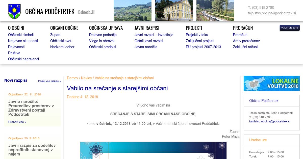 Vljudno vas vabim na SREČANJE S STAREJŠIMI OBČANI NAŠE OBČINE, ko bo v četrtek, 13.12.2018 ob 11.00 uri, v Večnamenski športni dvorani Podčetrtek. Župan Peter Misja