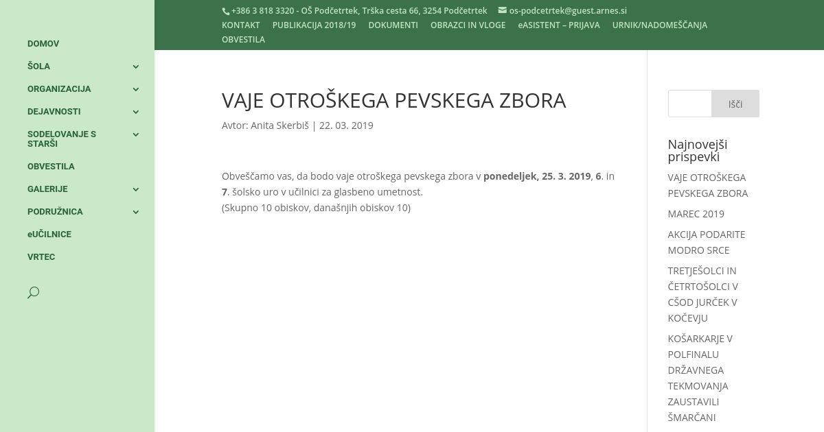 Obveščamo vas, da bodo vaje otroškega pevskega zbora v ponedeljek, 25. 3. 2019, 6. in 7. šolsko uro v učilnici za glasbeno umetnost.