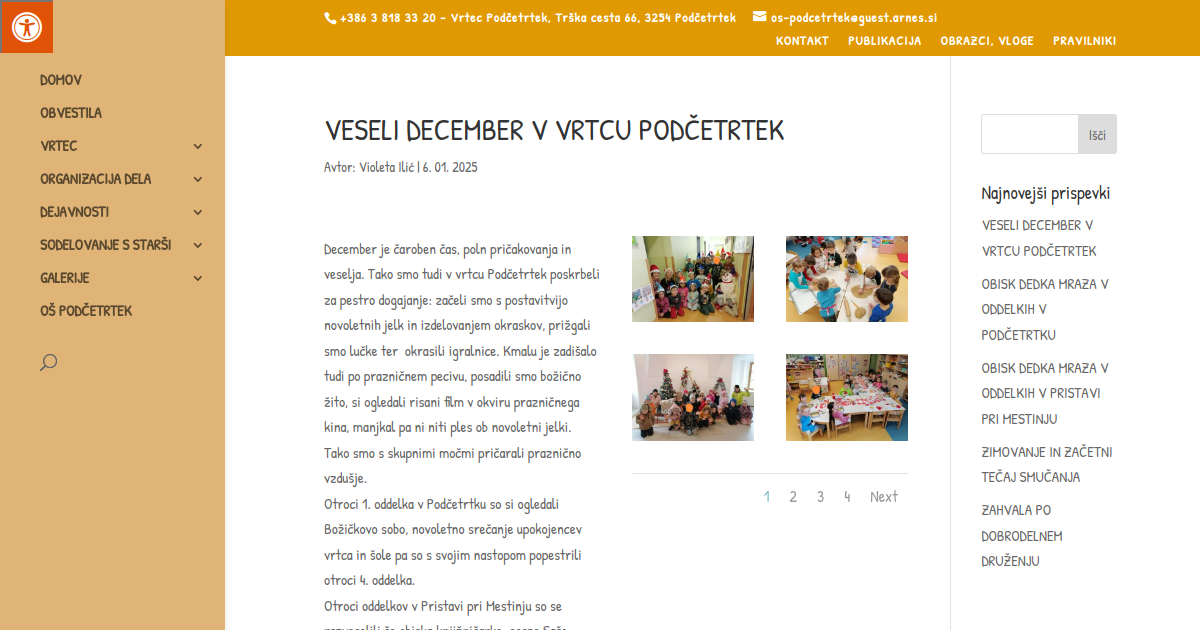December je čaroben čas, poln pričakovanja in veselja. Tako smo tudi v vrtcu Podčetrtek poskrbeli za pestro dogajanje: začeli smo s postavitvijo novoletnih jelk in izdelovanjem okraskov, prižgali smo lučke ter okrasili igralnice. Kmalu je zadišalo tudi po prazničnem pecivu, posadili smo božično žito, si ogledali risani film v okviru prazničnega kina, manjkal pa ni niti ples ob novoletni jelki. Tako smo s skupnimi močmi pričarali praznično vzdušje. Otroci 1. oddelka v Podčetrtku so si ogledali Božičkovo sobo, novoletno srečanje upokojencev vrtca in šole pa so s svojim nastopom popestrili otroci 4. oddelka. Otroci oddelkov v Pristavi pri Mestinju so se razveselili še obiska knjižničarke, gospe Saše Sotošek, ki je z zgodbico Snežinka Božična želja otroke popeljala v svet domišljije in pričakovanja praznikov. Pripravili smo še skupinske voščilnice na oglasnih deskah oddelkov, celotno dogajanje pa smo zaključili s slavnostnim kosilom in obiskom dedka Mraza, kar je bilo za otroke prav posebno doživetje.