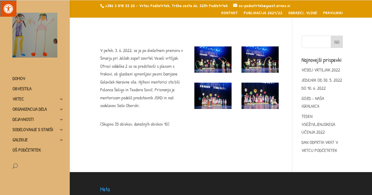 V petek, 3. 6. 2022, se je po dveletnem premoru v Šmarju pri Jelšah zopet zavrtel Veseli vrtiljak. Otroci oddelka 2 so se predstavili s plesom s trakovi, ob glasbeni spremljavi pesmi Damjane Golavšek Naravne sile. Njihovi mentorici sta bili Polonca Šeligo in Teodora Sovič. Priznanja je mentoricam podelil predstavnik JSKD in naš sodelavec Sašo Oberski.