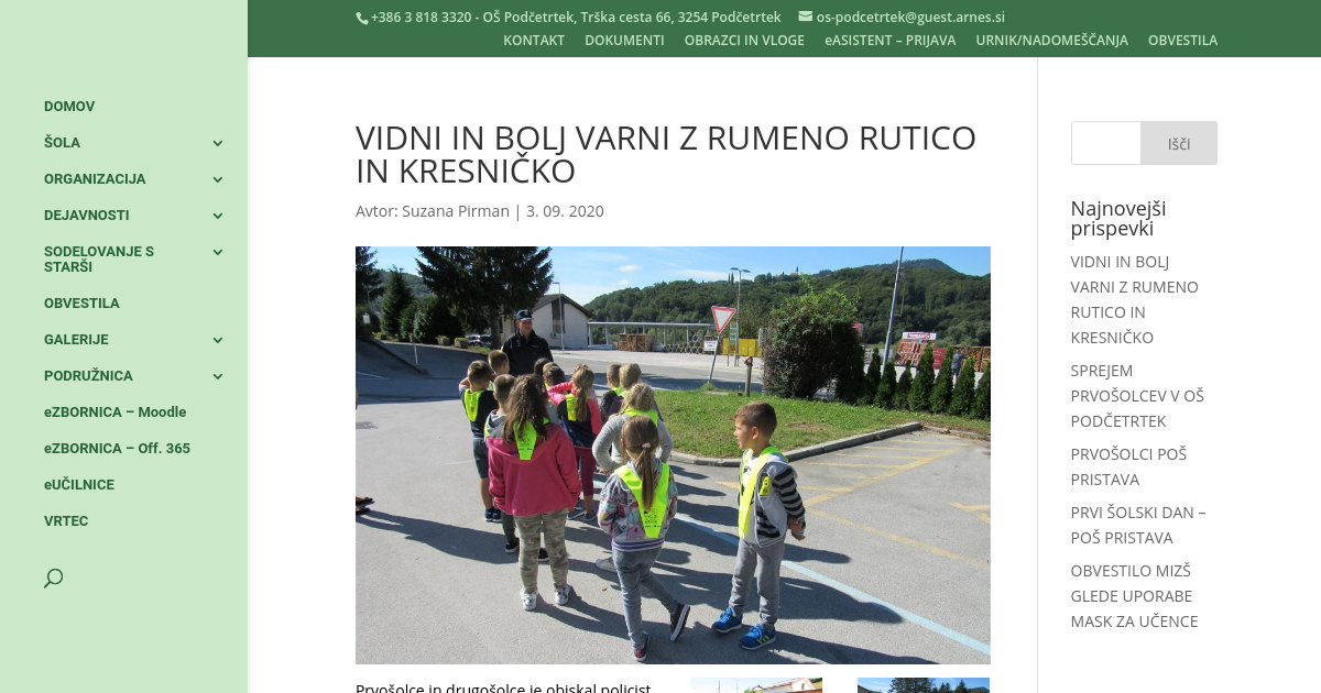 Prvošolce in drugošolce je obiskal policist g. Marko Krč z namenom, da jih pouči o varnosti v prometu. Prvošolcem je prinesel rumene rutice in kresničke. Na šolskem dvorišču so najprej skupaj obnovili svoje znanje o prometni varnosti, nato pa so odšli na sprehod po bližnji okolici. Naučili so se pravilno in varno prečkati cesto po prehodu za pešce. Opazovali in opisovali so promet in prometne znake. Policist je učence opozoril na nevarnosti in pasti na cesti. Poudaril je, da morajo prvošolci in drugošolci vsak dan imeti na poti v šolo in iz nje rumeno rutico. Ta jih bo naredila bolj vidne in zato bolj varne. Opozoril jih je tudi na to, da morajo biti med vožnjo v avtu vedno pripeti in na otroškem sedežu. Kadar pa so v prometu udeleženi kot kolesarji, morajo obvezno nositi čelado.