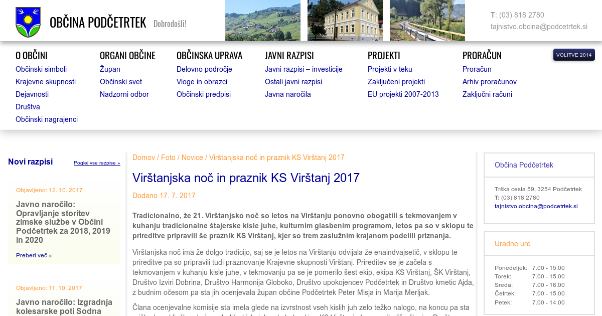 Tradicionalno, že 21. Virštanjsko noč so letos na Virštanju ponovno obogatili s tekmovanjem v kuhanju tradicionalne štajerske kisle juhe, kulturnim glasbenim programom, letos pa so v sklopu te prireditve pripravili še praznik KS Virštanj, kjer so trem zaslužnim krajanom podelili priznanja. Virštanjska noč ima že dolgo tradicijo, saj se je letos na Virštanju odvijala že