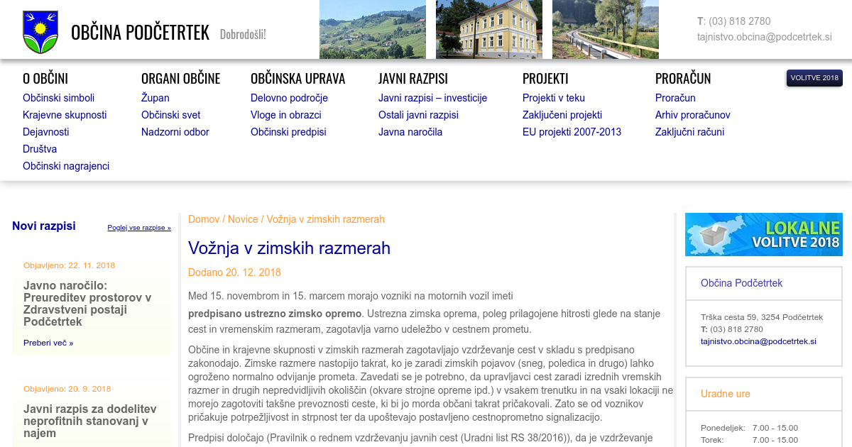 Med 15. novembrom in 15. marcem morajo vozniki na motornih vozil imeti predpisano ustrezno zimsko opremo. Ustrezna zimska oprema, poleg prilagojene hitrosti glede na stanje cest in vremenskim razmeram, zagotavlja varno udeležbo v cestnem prometu. Občine in krajevne skupnosti v zimskih razmerah zagotavljajo vzdrževanje cest v skladu s predpisano zakonodajo. Zimske razmere nastopijo takrat, ko