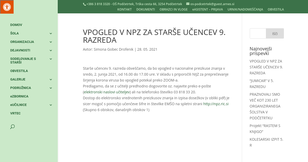 Starše učencev 9. razreda obveščamo, da bo vpogled v nacionalne preizkuse znanja v sredo, 2. junija 2021, od 16.00 do 17.00 ure. V skladu s priporočili NIJZ za preprečevanje širjenja korona virusa bo vpogled potekal preko ZOOM-a. Predlagamo, da se z učitelji predhodno dogovorite oz. najavite preko e-pošte (elektronski naslovi učiteljev) ali na telefonsko številko 03 818 33 20. Dostop do elektronsko vrednotenih preizkusov znanja in izpisa dosežkov (v obliki pdf) je sicer mogoč s pomočjo učenčeve šifre in številke EMŠO na spletni strani http://npz.ric.si