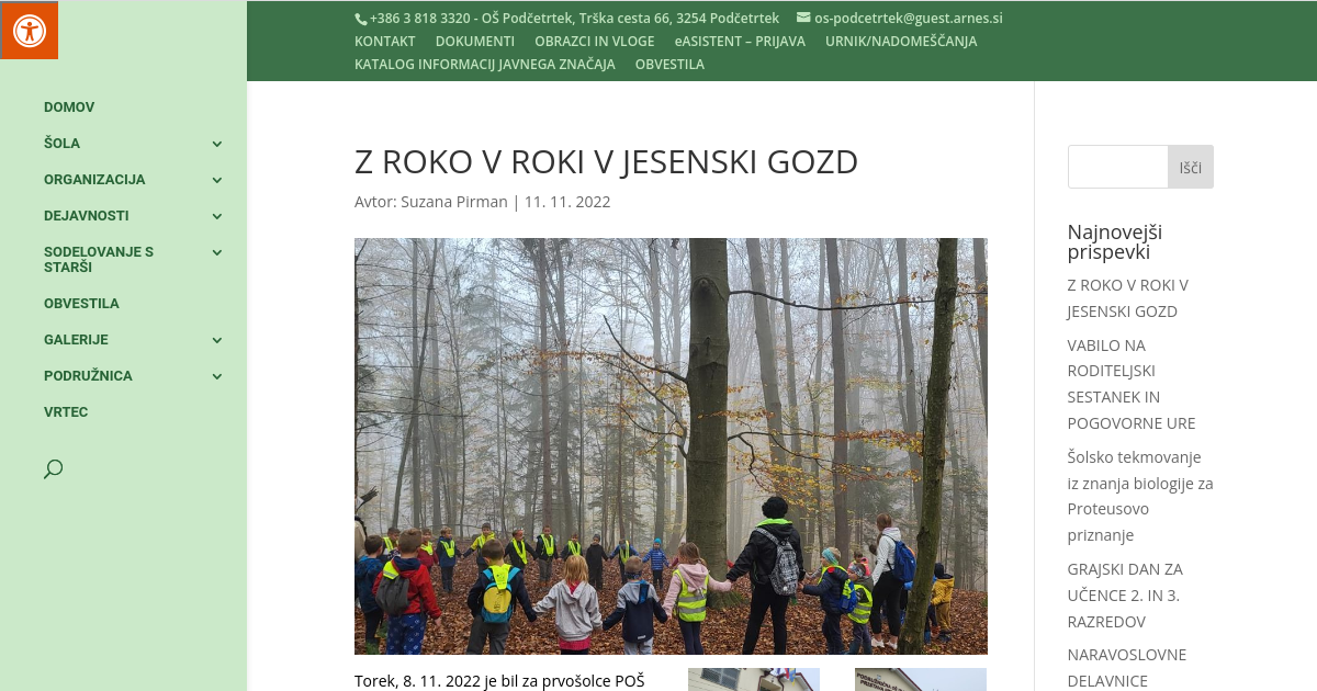 Torek, 8. 11. 2022 je bil za prvošolce POŠ Pristava prav poseben dan, saj je ta dan pouk potekal v naravi, ki je jeseni še posebno barvita in zanimiva. Z roko v roki z otroki najstarejše skupine vrtca Pristava, so se učenci v meglenem jutru odpravili v bližnji gozd. Že pred vstopom v gozd, so ponovili pravila gozdnega bontona. Gozd so doživljali in raziskovali z različnimi čutili, objeli so debla različnih dreves, prisluhnili so zvokom narave in ptičjemu petju. Različne dejavnosti so potekale v treh skupinah, ki so jih vodile vzgojiteljica Sanja ter učiteljici Anja in Suzana. Otroci so spoznavali različna drevesa in njihove plodove, naredili odtise lubja, se pogovarjali o gozdnih prebivalcih ter iskali in opazovali drobne živali. Seveda je pri tem bila potrebna velika mera potrpežljivosti. Iz suhih vej in odpadlih listov so oblikovali »gozdne slike«. Ob zanimivih gibalnih nalogah in prosti igri so se dobro razgibali. Na posekanih deblih so si privoščili sadno malico ter med pogovorom in razmišljanjem prišli do spoznanja, da je v gozdu lahko kljub megli prijetno, poučno in zabavno. Veseli so se vrnili v šolo in vrtec ter se dogovorili, da bodo skupaj še večkrat odšli v gozd.