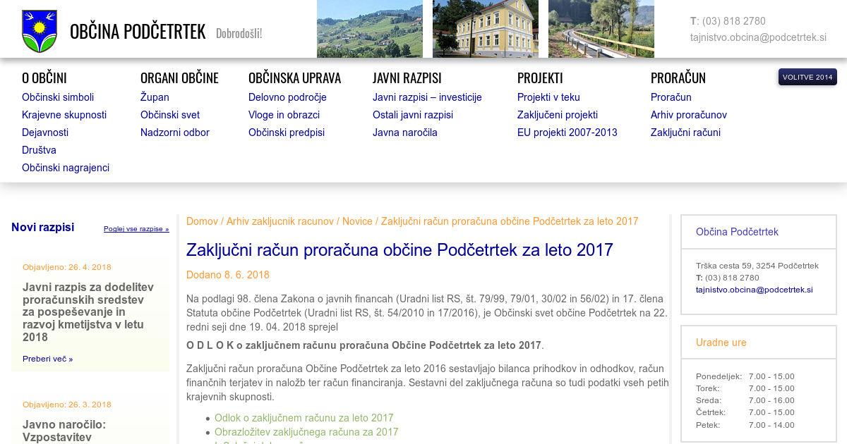 Na podlagi 98. člena Zakona o javnih financah (Uradni list RS, št. 79/99, 79/01, 30/02 in 56/02) in 17. člena Statuta občine Podčetrtek (Uradni list RS, št. 54/2010 in 17/2016), je Občinski svet občine Podčetrtek na 22. redni seji dne 19. 04. 2018 sprejel O D L O K o zaključnem računu proračuna Občine Podčetrtek