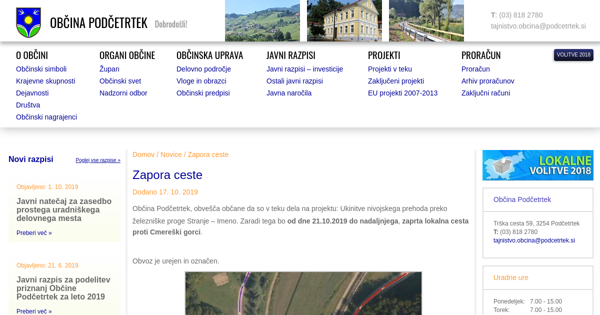 Občina Podčetrtek, obvešča občane da so v teku dela na projektu: Ukinitve nivojskega prehoda preko železniške proge Stranje – Imeno. Zaradi tega bo od dne 21.10.2019 do nadaljnjega, zaprta lokalna cesta proti Cmereški gorci. Obvoz je urejen in označen. Priloga: obvestilo