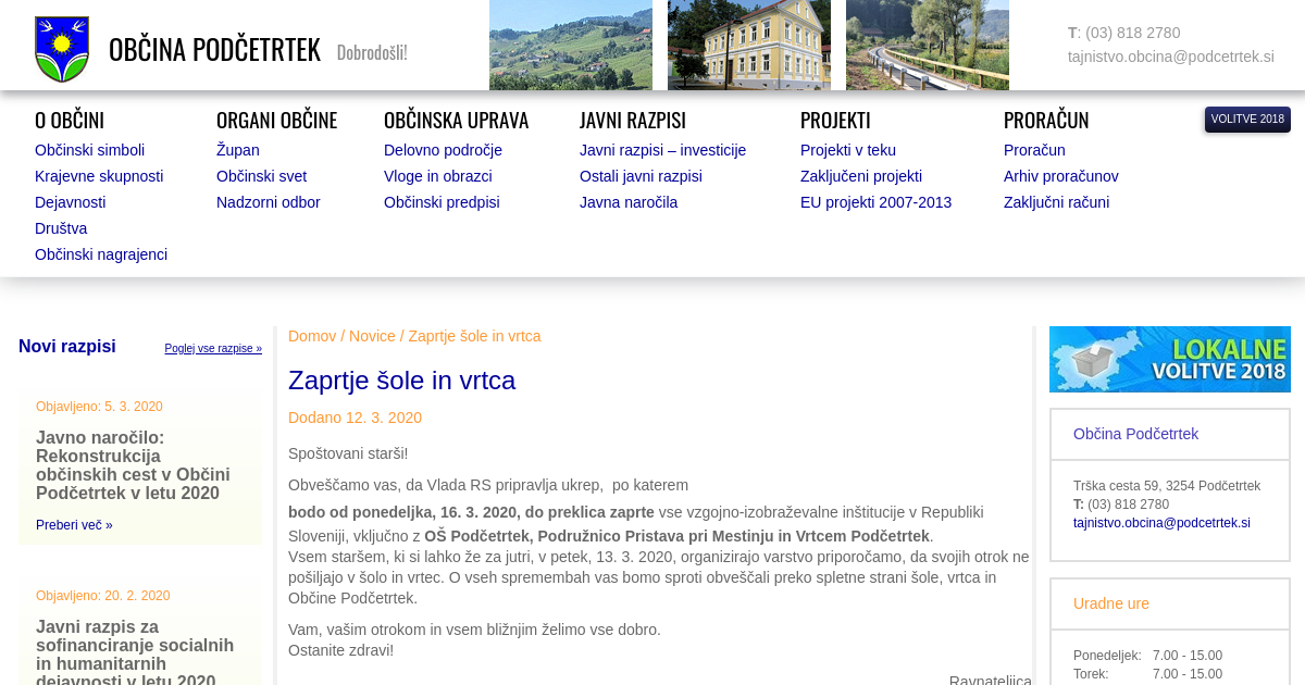 Spoštovani starši! Obveščamo vas, da Vlada RS pripravlja ukrep, po katerem bodo od ponedeljka, 16. 3. 2020, do preklica zaprte vse vzgojno-izobraževalne inštitucije v Republiki Sloveniji, vključno z OŠ Podčetrtek, Podružnico Pristava pri Mestinju in Vrtcem Podčetrtek. Vsem staršem, ki si lahko že za jutri, v petek, 13. 3. 2020, organizirajo varstvo priporočamo, da svojih