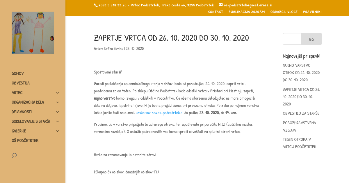 ZAPRTJE VRTCA OD 26. 10. 2020 DO 30. 10. 2020