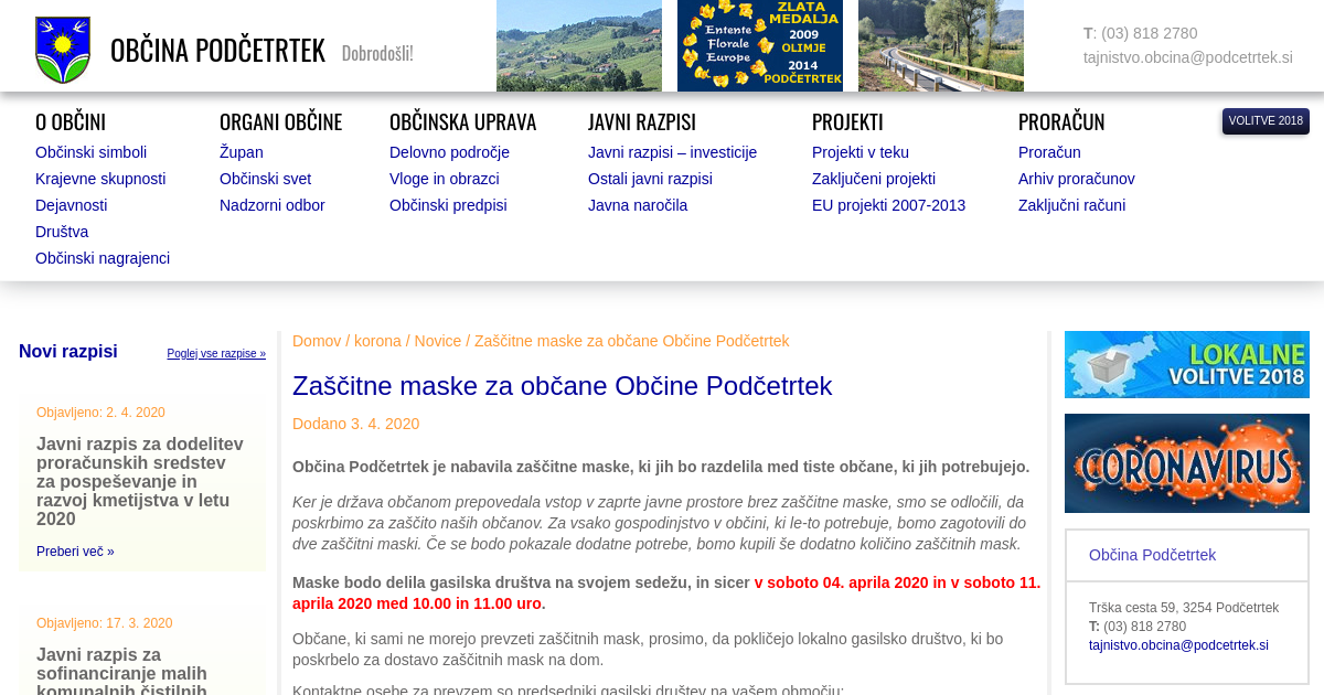 Občina Podčetrtek je nabavila zaščitne maske, ki jih bo razdelila med tiste občane, ki jih potrebujejo. Ker je država občanom prepovedala vstop v zaprte javne prostore brez zaščitne maske, smo se odločili, da poskrbimo za zaščito naših občanov. Za vsako gospodinjstvo v občini, ki le-to potrebuje, bomo zagotovili do dve zaščitni maski. Če se bodo