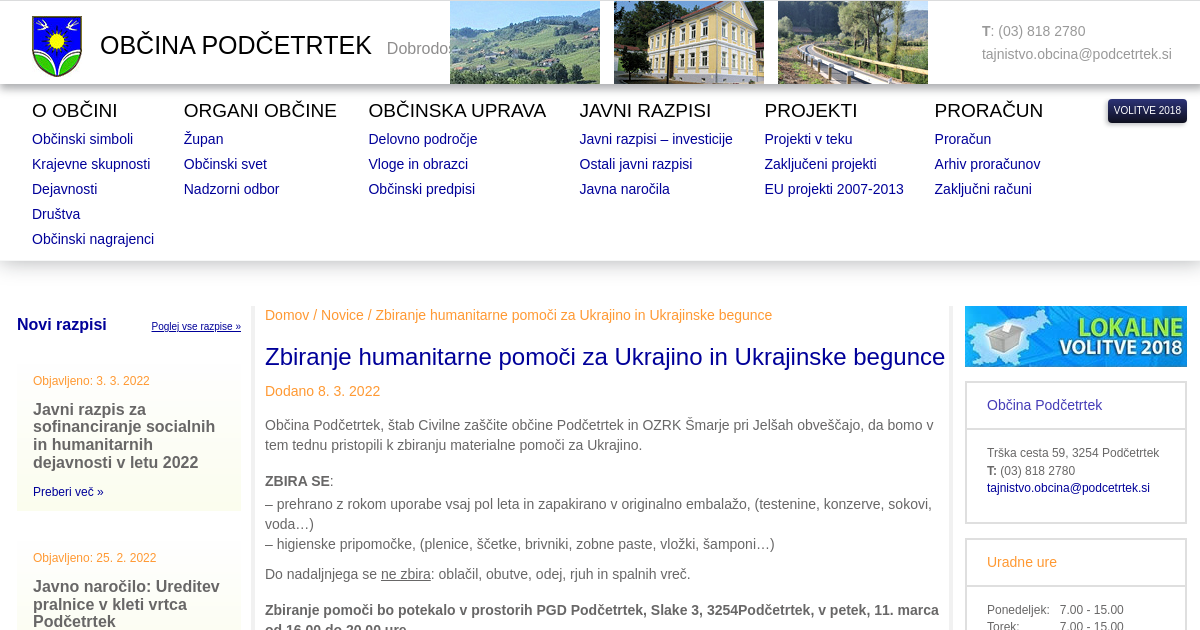Občina Podčetrtek, štab Civilne zaščite občine Podčetrtek in OZRK Šmarje pri Jelšah obveščajo, da bomo v tem tednu pristopili k zbiranju materialne pomoči za Ukrajino. ZBIRA SE: – prehrano z rokom uporabe vsaj pol leta in zapakirano v originalno embalažo, (testenine, konzerve, sokovi, voda…) – higienske pripomočke, (plenice, ščetke, brivniki, zobne paste, vložki, šamponi…) Do