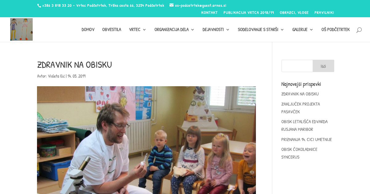V ponedeljek, 13.5.2019 nas je v 1.oddelku vrtca v Pristavi pri Mestinju obiskal zdravnik dr. Andrej Jazbec, ki se je prijazno odzval našemu povabilu v okviru projekta ‘Moje telo in zdravje’, ki ga v našem oddelku izvajamo že nekaj mesecev. Otroci so najprej opisali zgradbo in delovanje človeškega telesa, zdravo prehrano in skrb za zdravje, dr. Jazbec pa je njihovo znanje še dopolnil z nekaterimi podrobnostmi in zanimovostmi. S sabo je prinesel tudi svojo zdravniško torbo z nekaterimi instrumenti, ki so si jih otroci z velikim zanimanjem ogledali ter tudi preizkusili – poslušali so bitje srca, pljuča, si ogledali notranjost ušesa ter ustne votline, posebno zanimiv pa je bil mikroskop, s pomočjo katerega so si otroci podrobneje ogledali kapljico krvi. Dr. Jazbecu se za obisk lepo zahvaljujemo, saj nam je s svojim obiskom popestril dan ter otroke še dodatno motiviral da bodo še naprej skrbeli za svoje telo in s tem za zdravje, ki je naše največje bogastvo.
