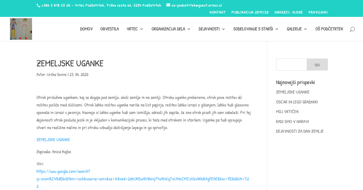 Otrok prisluhne ugankam, kaj se dogaja pod zemljo, okoli zemlje in na zemlji. Otroku uganko preberemo, otrok pove rešitev ali rešitev poišče med sličicami. Otrok lahko rešitev uganke nariše na list papirja, rešitev lahko izrazi z gibanjem, lahko tudi glasovno oponaša in izrazi s pesmijo. Kasneje si lahko uganke tudi sam izmišlja, odrasli jih zapiše, če zna otrok pisati jih sam zabeleži. Pri tej dejavnosti otrok posluša jezik in je vključen v komunikacijski proces, ki teče med otrokom in staršem. Uganke pa tudi opisujejo stvari na različne načine in pri otroku vzbudijo doživljanje lepega in ga sprostijo.