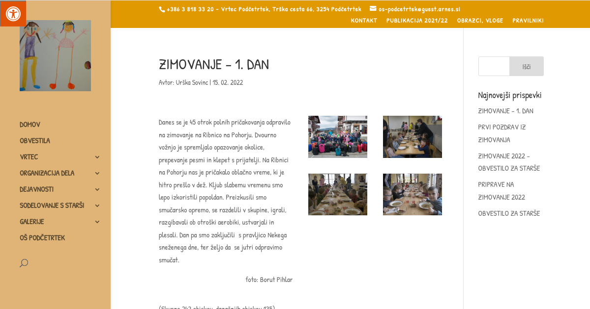 Danes se je 45 otrok polnih pričakovanja odpravilo na zimovanje na Ribnico na Pohorju. Dvourno vožnjo je spremljalo opazovanje okolice, prepevanje pesmi in klepet s prijatelji. Na Ribnici na Pohorju nas je pričakalo oblačno vreme, ki je hitro prešlo v dež. Kljub slabemu vremenu smo lepo izkoristili popoldan. Preizkusili smo smučarsko opremo, se razdelili v skupine, igrali, razgibavali ob otroški aerobiki, ustvarjali in plesali. Dan pa smo zaključili s pravljico Nekega sneženega dne, ter željo da se jutri odpravimo smučat.