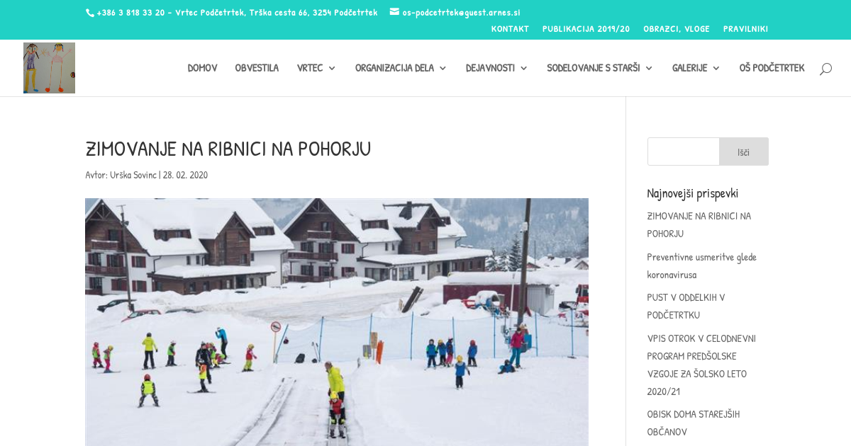 Zimovanje predšolskih otrok bo potekala od ponedeljka, 2. 3. 2020, do četrtka, 5. 3. 2020. Smučali bomo na smučišču Ribnica na Pohorju in bivali v Apartmajih Ribnica. Odhod otrok na zimovanje bo v ponedeljek, 2. 3. 2020, ob 8.10 izpred OŠ Podčetrtek. Otroci se bodo vrnili v Podčetrtek v četrtek, 5. 3. 2020 med 12.00 in 12.30. Avtobus jih bo odložil pred OŠ Podčetrtek, kjer otroka prevzamete. Smučarski pozdrav.