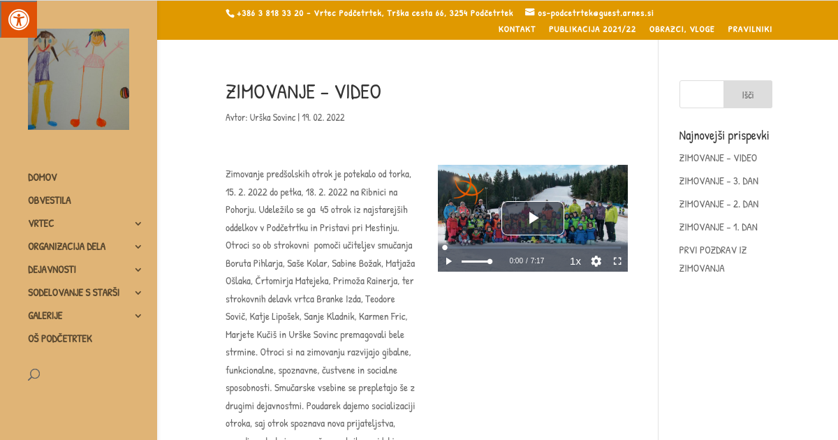 Zimovanje predšolskih otrok je potekalo od torka, 15. 2. 2022 do petka, 18. 2. 2022 na Ribnici na Pohorju. Udeležilo se ga 45 otrok iz najstarejših oddelkov v Podčetrtku in Pristavi pri Mestinju. Otroci so ob strokovni pomoči učiteljev smučanja Boruta Pihlarja, Saše Kolar, Sabine Božak, Matjaža Ošlaka, Črtomirja Matejeka, Primoža Rainerja, ter strokovnih delavk vrtca Branke Izda, Teodore Sovič, Katje Lipošek, Sanje Kladnik, Karmen Fric, Marjete Kučiš in Urške Sovinc premagovali bele strmine. Otroci si na zimovanju razvijajo gibalne, funkcionalne, spoznavne, čustvene in socialne sposobnosti. Smučarske vsebine se prepletajo še z drugimi dejavnostmi. Poudarek dajemo socializaciji otroka, saj otrok spoznava nova prijateljstva, ponudi medsebojno pomoč sovrstniku, pridobiva pozitivne navade… Otroci iz dneva v dan postajajo bolj samostojni in s tem se krepi tudi njihova samozavest. Otroci so bili kljub daljši ločenosti od staršev veseli in polni novih izkušenj. Z nasmehom na licih in z zasluženo medaljo so se v petek, 18. 2. 2022, vrnili v objem staršev, ki so jih že nestrpno čakali.