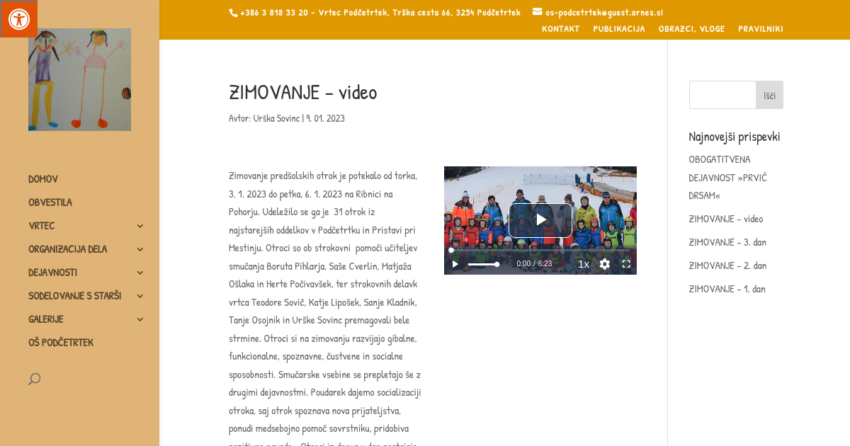 Zimovanje predšolskih otrok je potekalo od torka, 3. 1. 2023 do petka, 6. 1. 2023 na Ribnici na Pohorju. Udeležilo se ga je 31 otrok iz najstarejših oddelkov v Podčetrtku in Pristavi pri Mestinju. Otroci so ob strokovni pomoči učiteljev smučanja Boruta Pihlarja, Saše Cverlin, Matjaža Ošlaka in Herte Počivavšek, ter strokovnih delavk vrtca Teodore Sovič, Katje Lipošek, Sanje Kladnik, Tanje Osojnik in Urške Sovinc premagovali bele strmine. Otroci si na zimovanju razvijajo gibalne, funkcionalne, spoznavne, čustvene in socialne sposobnosti. Smučarske vsebine se prepletajo še z drugimi dejavnostmi. Poudarek dajemo socializaciji otroka, saj otrok spoznava nova prijateljstva, ponudi medsebojno pomoč sovrstniku, pridobiva pozitivne navade… Otroci iz dneva v dan postajajo bolj samostojni in s tem se krepi tudi njihova samozavest. Otroci so bili kljub daljši ločenosti od staršev veseli in polni novih izkušenj. Z nasmehom na licih in z zasluženo medaljo so se v petek, 6. 1. 2023, vrnili v objem staršev, ki so jih že nestrpno čakali.