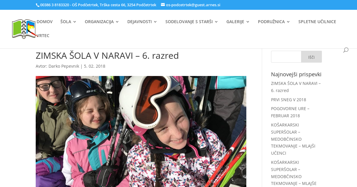Šestošolci so preživeli prijeten teden na smučišču Trije kralji, na bistriškem Pohorju. Vsak dan so urili svoje smučarsko znanje. Po smučanju, ob večerih, so bile na urniku različne dejavnosti – bowling, nočni pohod z baklami, filmski večer, pisanje pisma domačim, spoznavanje živalstva in rastlinstva na Pohorju, kulturni program in podelitev medalj … Teden je hitro minil, bilo je kratko, a sladko!