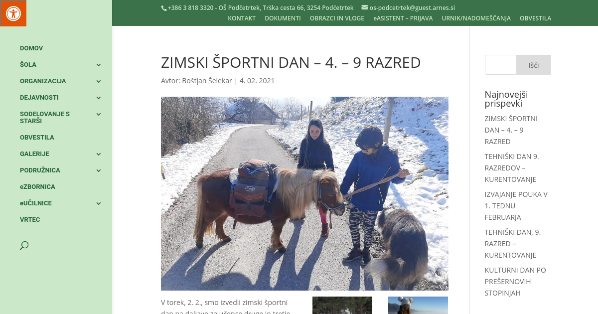 V torek, 2. 2., smo izvedli zimski športni dan na daljavo za učence druge in tretje triade matične in podružnične šole. Ker je čez vikend naše kraje pobelil sneg in to bila verjetno zadnja pošiljka snega v letošnji zimi smo seveda to hitro izkoristili. Učenke in učenci so imeli na voljo različne dejavnosti, ki so jih izbrali in izvedli po lastni želji. Tako lahko na slikah vidite pohodnike, sankače, smučarje in celo deskarja. Manjkalo seveda tudi ni kepanja, izdelovanja snežakov in drugih zimskih dogodivščin. Cilji so bili z nasmejanimi obrazi doseženi, a hkrati upamo, da je to naš zadnji športni dan na daljavo, saj so športne aktivnosti v družbi celotnega razreda še lepše. Utrinke s športnega dneva pa si lahko ogledate v fotogaleriji.
