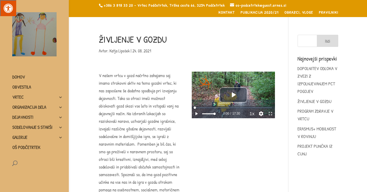 V našem vrtcu v gozd načrtno zahajamo saj imamo strokovni aktiv na temo gozdni vrtec, ki nas zaposlene še dodatno spodbuja pri izvajanju dejavnosti. Tako so otroci imeli možnost obiskovati gozd skozi vse leto in vstopali vanj na dejavnejši način. Na izbranih lokacijah so raziskovali naravo, ustvarjali gozdne igralnice, izvajali različne gibalne dejavnosti, razvijali sodelovalne in domišljijske igre, se igrali z naravnim materialom. Pomemben je bil čas, ki smo ga preživeli v naravnem prostoru, saj so otroci bili kreativni, iznajdljivi, med seboj sodelovali in pridobivali občutek samostojnosti in samozavesti. Spoznali so, da ima gozd pozitivne učinke na vse nas in da igra v gozdu otrokom pomaga na osebnostnem, socialnem, motoričnem in kognitivnem področju. Gozd je naša igralnica in dneva preživetega v gozdu otroka ne moremo naučiti, mora ga doživeti. Ob zaključku strokovnega aktiva je nastal kratek film, kako so otroci uživali ob igri in doživeli bivanje v gozdu. Dragi starši, dovolite otrokom, da se soočijo z izzivi v čarobnem gozdu.