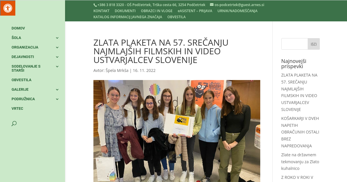 Gledališka skupina Malinovci (učenke so se letos preimenovale v Malince) na naši osnovni šoli deluje že mnogo let. Malince so v šolskem letu 2021/22 v okviru izbirnega predmeta gledališki klub ustvarile igrani film Po motivih pravljice zrcalce (Gregor Vitez), ki je bil premierno uprizorjen na šolski proslavi ob slovenskem kulturnem prazniku, 4. februarja 2022. S filmom se nam je uspelo uvrstiti na 57. srečanje najmlajših filmskih in video ustvarjalcev Slovenije, ki je potekalo v torek, 15. 11. 2022, v Novem mestu (v Kulturnem centru Janeza Trdine). Organizator srečanja je Javni sklad Republike Slovenije za kulturne dejavnosti. Izbor filmov za državno srečanje je opravila selektorica, režiserka Kaya Tokuhisa, ki je izmed 50-ih filmov, ki so se prijavili na srečanje, izbrala najboljših 15. Gre za različne žanre – igrani filmi, dokumentarni filmi in animirani filmi. Na srečanju so predvajali projekcije izbranih filmov. Lepo se je bilo gledati na velikem platnu. Potekale so številne filmske delavnice za otroke in mentorje. Srečanje se je končalo s podelitvijo nagrad in priznanj. Malince so prejele zlato plaketo! Veseli smo, saj je to že drugi večji uspeh naše šolske gledališke skupine na državni ravni.