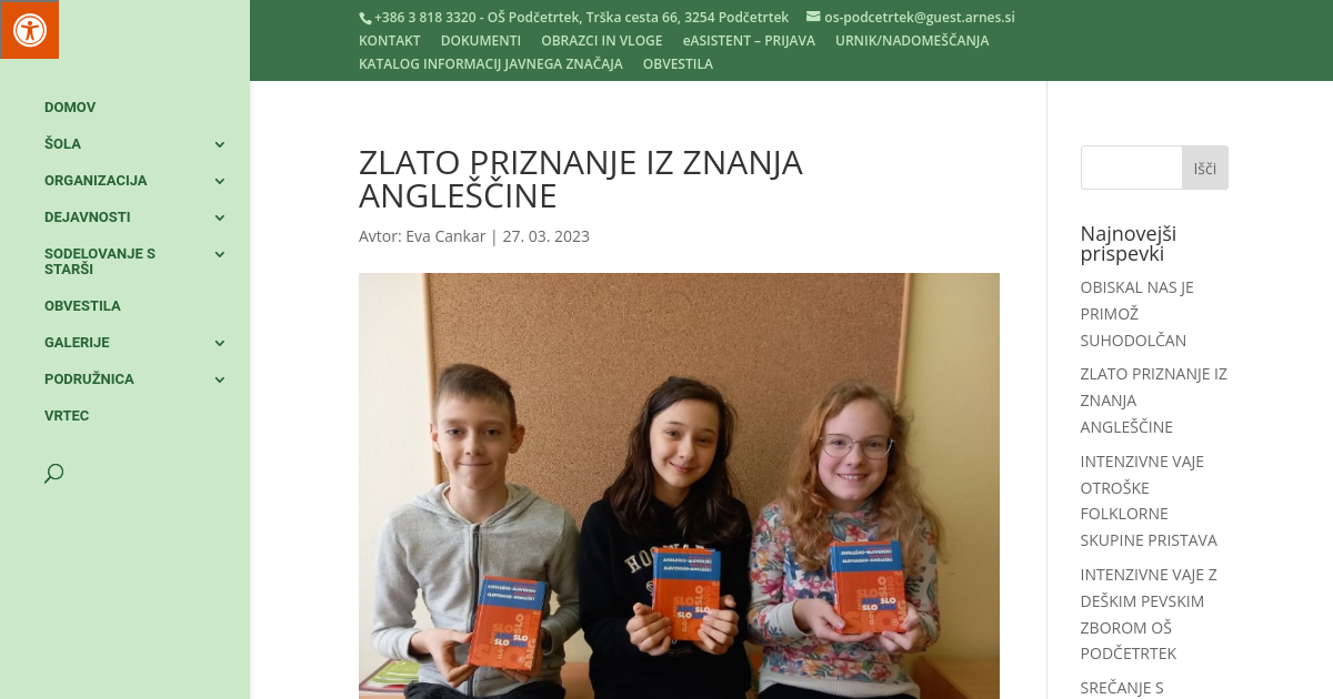 Učenka Ana Žerjav iz 6. A razreda se je udeležila državnega tekmovanja iz znanja angleščine za 6. razred in usvojila zlato priznanje. Tema državnega tekmovanja je bila Food – tell me what you eat and I’ll tell you who you are. Tekmovanje ni vezano na določeno knjigo ali učbeniško gradivo, pač pa pokriva izbrana področja, s poudarkom na bralnem razumevanju, slušnem razumevanju, rabi jezika ter pisanju in uporabi lastnih idej. Učenci so glede na izbrano temo pridobili dodatna znanja s področja poznavanja hrana. Iskrene čestitke! Mentorica: Eva Cankar