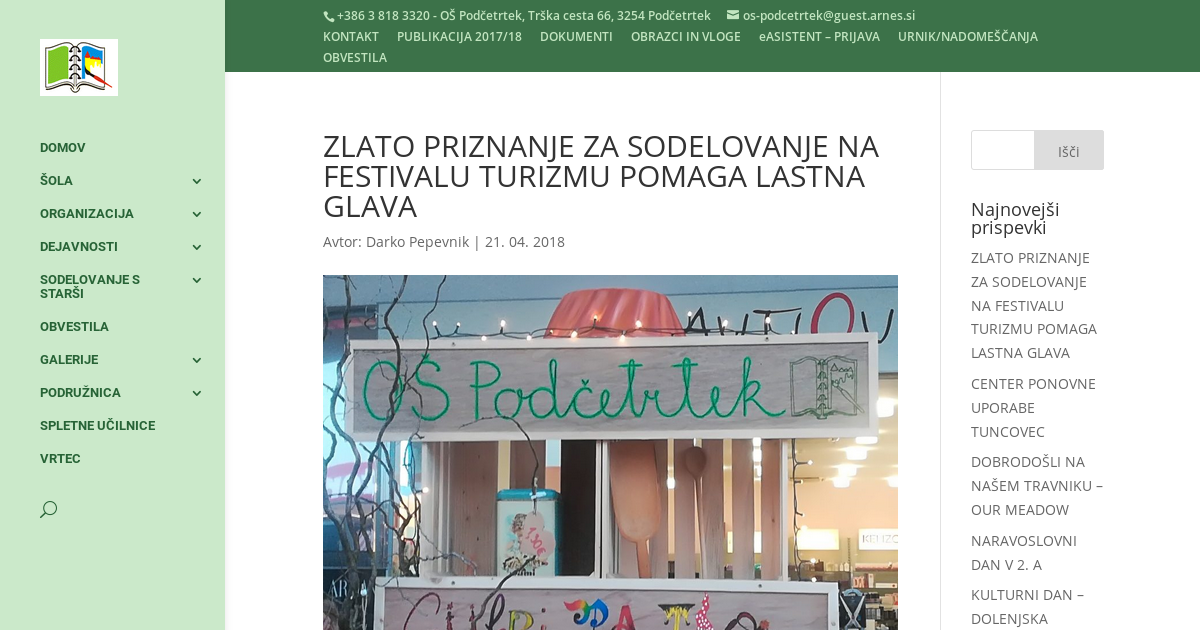 Projekt Turizmu pomaga lastna glava je celovit sistem organiziranega delovanja osnovnošolske mladine v turizmu. Vsebina projekta je vezana na raziskovanje turizma v domačem kraju, ugotavljanju možnosti za hitrejši razvoj in oblikovanje take ponudbe, ki bo vzpodbudila podjetništvo in trženje naravnih danosti ter tudi ostale ponudbe v vseh možnih oblikah. V šolskem letu 2017/2018 je bila razpisana tema KULTURA IN TURIZEM. Sodelovanje na festivalu je vključevalo izdelavo turistične naloge na razpisano temo, osredotočeno na oblikovanje turističnega proizvoda in njegovo javno predstavitev na turistični tržnici. Letos so pri projektu sodelovale Amanda Amon, Nika Herček, Samanta Šalamon, Larisa Ramšak in Eva Drofenik, pod mentorstvom Simone Gobec Drofenik in Eve Cankar. Učenke so izdelale turistično nalogo z naslovom CÜKRI PA TAO, oblikovale so stojnico, Facebook profil in pripravile animacijo. Na turistični tržnici v Celju, 5. aprila, so se več kot uspešno predstavile in osvojile zlato priznanje. To jim je omogočilo, da so svoj projekt predstavile tudi na zaključni tržnici v Mariboru. Zagotovo ne gre takšen uspeh pripisati samo inovativnosti, mladostni vedoželjnosti in delavnosti, ampak tudi uspešnemu sodelovanju s TD Podčetrtek, Občino Podčetrtek in ponudniki turističnih storitev v kraju in širše.