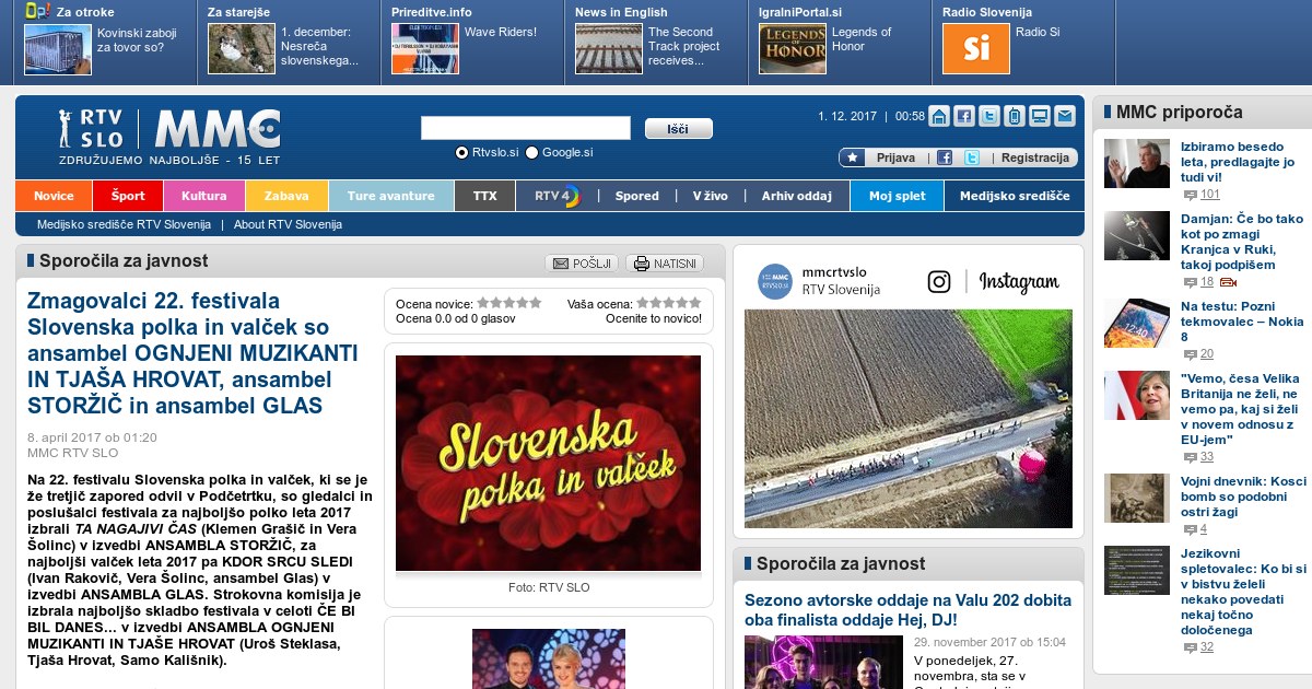 Zmagovalci 22. festivala Slovenska polka in valček so ansambel OGNJENI MUZIKANTI IN TJAŠA HROVAT, ansambel STORŽIČ in ansambel GLAS