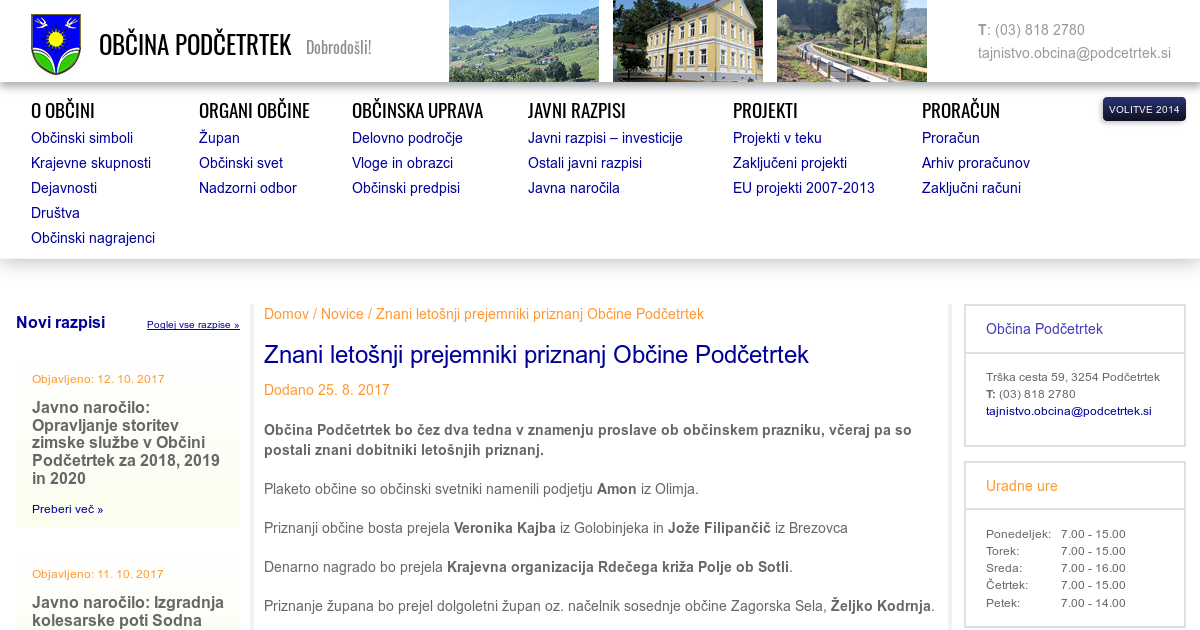 Občina Podčetrtek bo čez dva tedna v znamenju proslave ob občinskem prazniku, včeraj pa so postali znani dobitniki letošnjih priznanj. Plaketo občine so občinski svetniki namenili podjetju Amon iz Olimja. Priznanji občine bosta prejela Veronika Kajba iz Golobinjeka in Jože Filipančič iz Brezovca Denarno nagrado bo prejela Krajevna organizacija Rdečega križa Polje ob Sotli. Priznanje župana