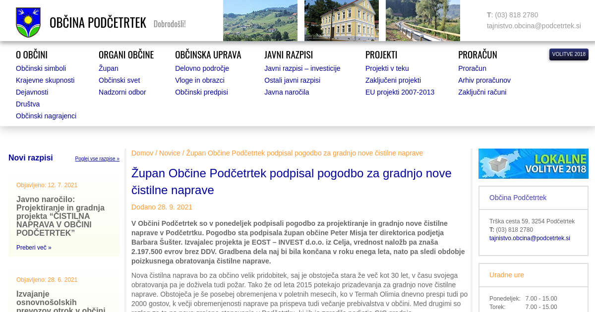 V Občini Podčetrtek so v ponedeljek podpisali pogodbo za projektiranje in gradnjo nove čistilne naprave v Podčetrtku. Pogodbo sta podpisala župan občine Peter Misja ter direktorica podjetja Barbara Šušter. Izvajalec projekta je EOST – INVEST d.o.o. iz Celja, vrednost naložb pa znaša 2.197.500 evrov brez DDV. Gradbena dela naj bi bila končana v roku enega