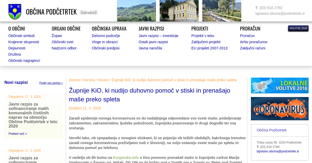 Zaradi epidemije novega koronavirusa so do nadaljnjega odpovedane vse svete maše, podeljevanje zakramentov, zakramentalov, ljudske pobožnosti, župnijska praznovanja in drugi dogodki ter vsa srečanja. Verniki tako, ob spopadanju z mnogimi stiskami, ki se pojavijo ob težkih obdobjih, kakršnega trenutno zaradi novega koronavirusa preživljamo tudi v Sloveniji, na voljo ostanejo svete maše po spletu in duhovna pomoč